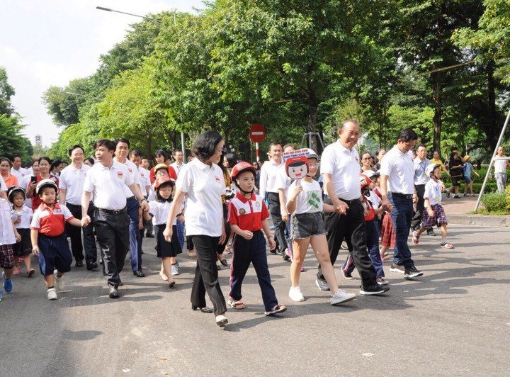 Phó Thủ tướng Thường trực Trương Hòa Bình – Chủ tịch Uỷ ban ATGT Quốc gia cho biết, cùng với không khí toàn dân đưa trẻ tới trường, chương trình đi bộ là thể hiện sự thống nhất ý chí, cùng nhau hành động, kêu gọi mọi người đội mũ bảo hiểm cho trẻ em.