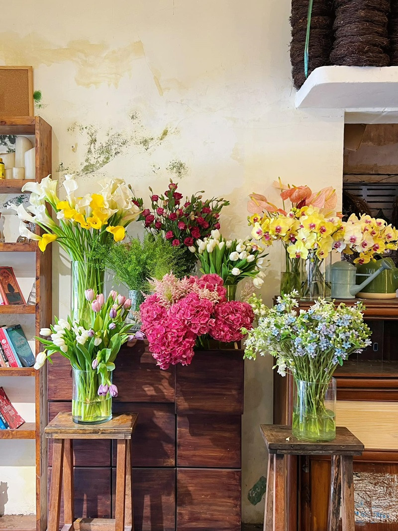 Không chỉ đơn thuần là một quán cà phê nhỏ đáng yêu, quán còn kết hợp thêm quầy hoa nhỏ “gây nhiều thương nhớ”. Một điều đặc biệt nữa của “nàng thơ” này là quán trang trí theo từng dịp trong năm, bạn sẽ dễ dàng tìm thấy hình ảnh chiếc đèn lồng lấp lánh đêm Trung Thu, cây thông nhỏ cùng những hộp quà vạn sắc khi Giáng sinh vừa tới hoặc những nhành mai vàng, câu đối đỏ rực rỡ trong quán khi Tết vừa chạm ngõ.