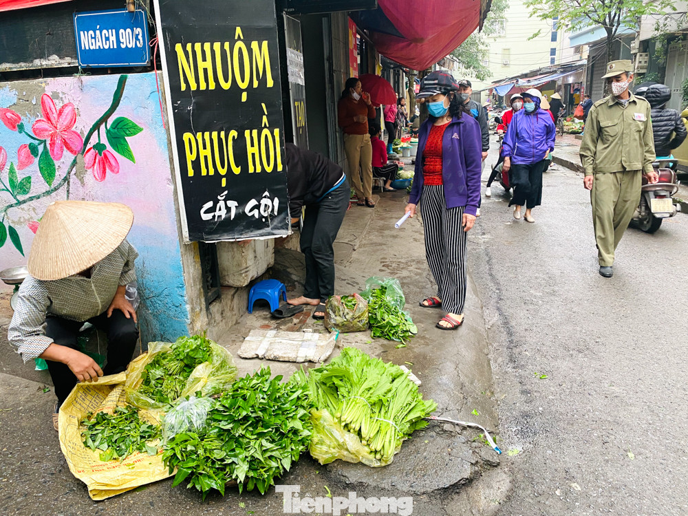 Tại chợ ngõ 90 phố Hoa Bằng (Yên Hoà, Cầu Giấy), tổ cơ động gồm tổ trưởng, tổ phó tổ dân phố và dân phòng liên tục đi nhắc nhở các tiểu thương và người dân giữ khoảng cách tối thiểu 2 mét