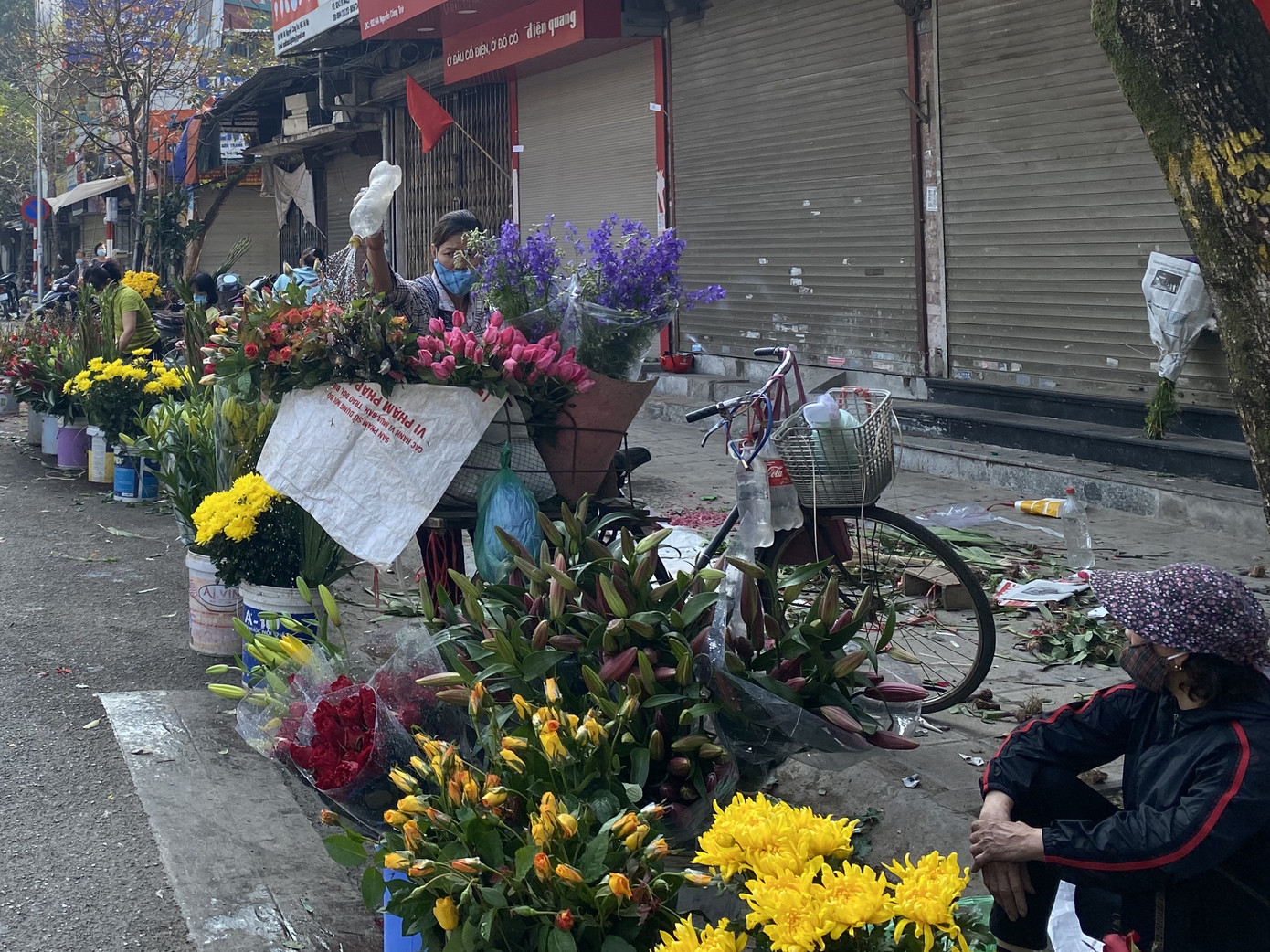 Khách lựa hoa bên chợ Nguyễn Công Trứ (Hà Nội). Quầy hàng trong chợ phần nhiều vẫn đóng cửa, các xe hoa thoải mái đỗ vỉa hè buôn bán