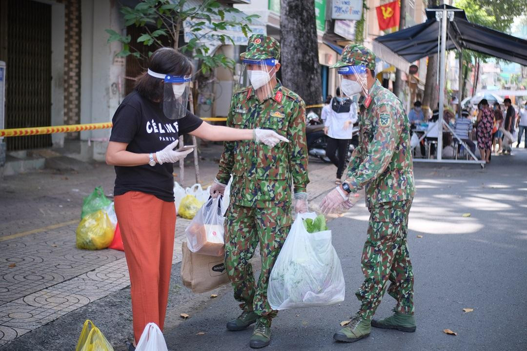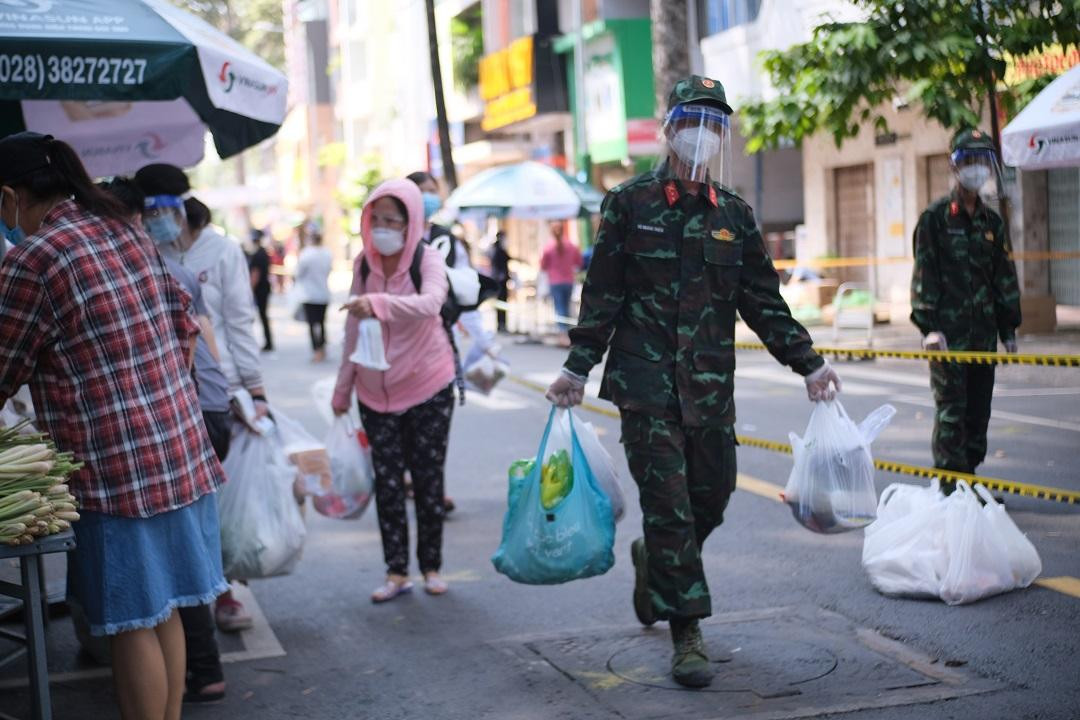 Ngay từ sáng sớm các ngày, những chiến sĩ thuộc sư đoàn 330, quân khu 4 có mặt tại chợ “lưu động” trên đường Trần Bình Trọng, phường 3, quận 5, TP.HCM hướng dẫn người dân giữ khoảng cách khi vào chợ và xách đồ giúp dân.