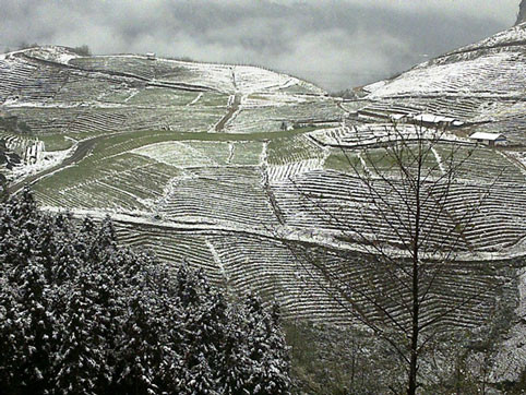 Vào giữa đông, Mộc Châu như chuyển mình đẹp hơn, hấp dẫn hơn với sắc hồng phơn phớt của những cành đào Pháp, trắng tinh khiết của những chùm hoa mận. Thời tiết Mộc Châu vào mùa đông có thể xuống dưới 10 độ, tuy nhiên giữa tiết trời se lạnh, sương mù giăng giăng trên những đồi chè khiến Mộc Châu mùa này mang vẻ bình yên và lặng lẽ.