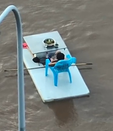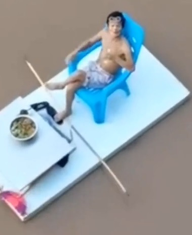TPO - Cảnh quay được chia sẻ trên mạng xã hội cho thấy một người đàn ông thư thả nằm trên một chiếc bè tự chế trôi giữa dòng nước, với bàn ghế và nồi đầy thức ăn.