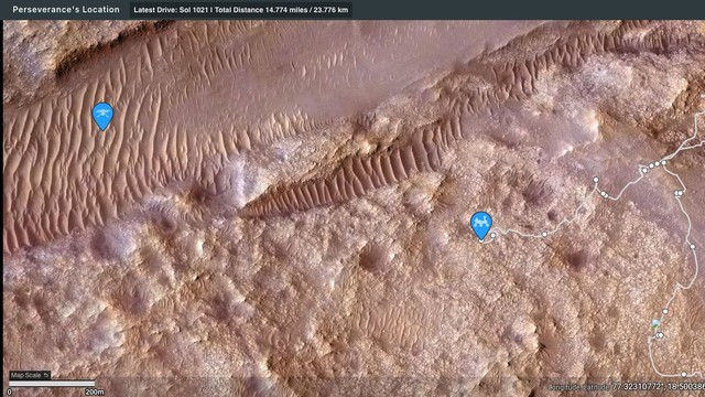 Vị trí cuối cùng được xác định của chiếc trực thăng Ingenutiy (dấu màu xanh phía trên, bên trái) và chiếc rover Perseverance, cặp đôi đang săn tìm sự sống ngoài hành tinh của Sao Hỏa - Ảnh: NASA