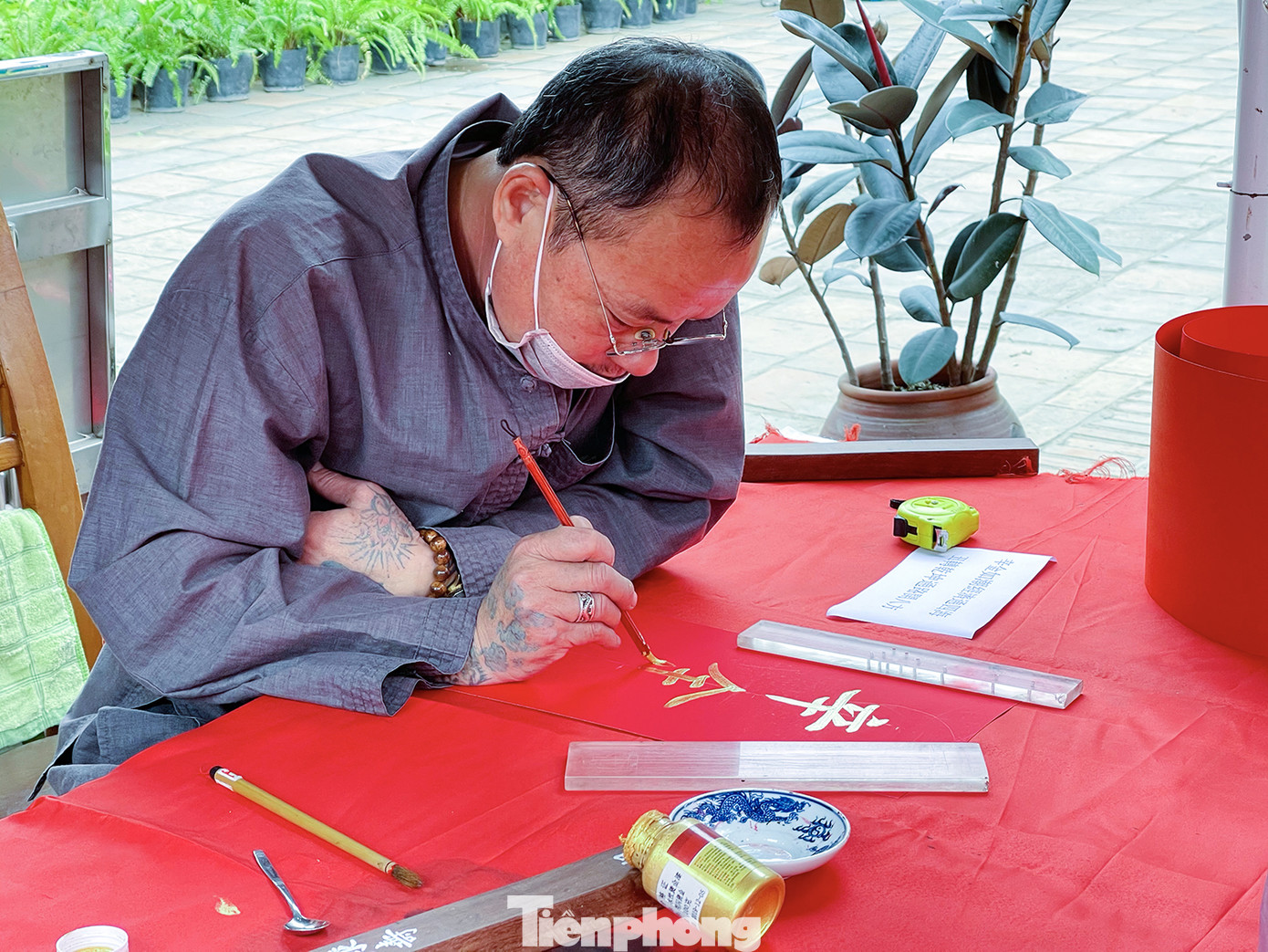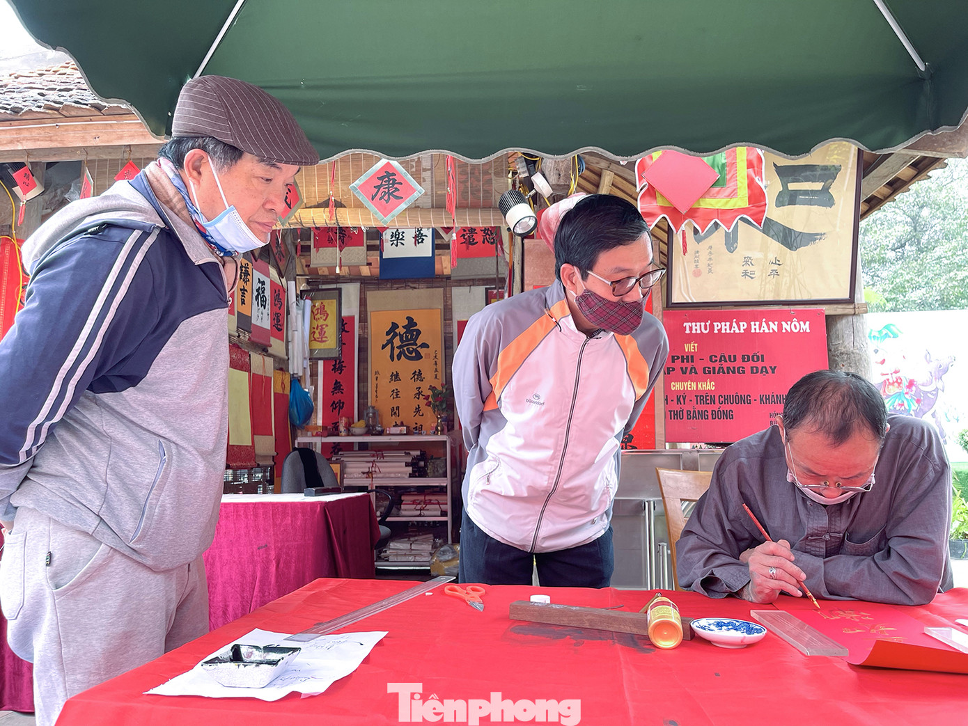 Công tác phòng, chống dịch được thực hiện rất nghiêm chỉnh với nước sát khuẩn và khẩu trang y tế cho người dân đến thăm quan, xin chữ.