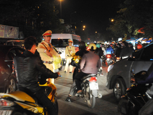 Lực lượng CSGT – CSTT – CSCĐ phải lập “hàng rào sống” để điều tiết, phân luồng giao thông. Nhờ đó, tình trạng ùn tắc kéo dài như mọi năm không còn xảy ra.