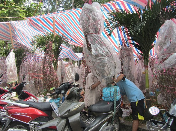 Đào, quất, mai và các loại hoa được người mua chất lên xe nườm nượp, một số ít người đàn ông có sức khỏe và chạy xe vững tự chở về, còn lại đa số nhờ tài xế xe ôm chở thuê. Từ sáng sớm đến chiều, anh Hoàng Văn Nam đã chở được 7 chuyến hàng, anh cũng kiếm được hơn triệu đồng.