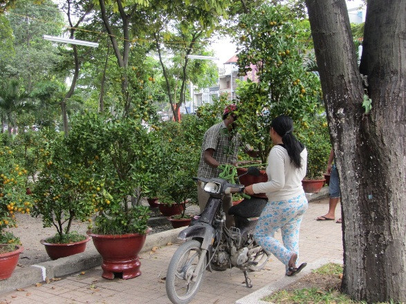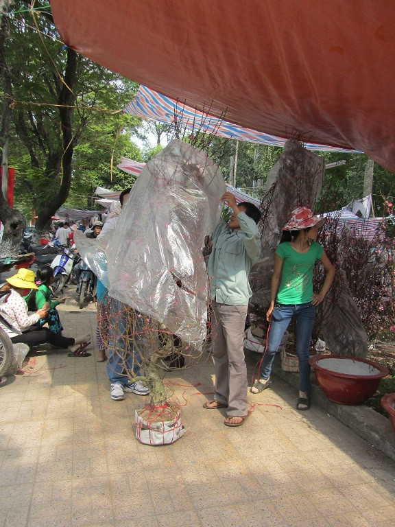 Khi khách đã ưng ý mua hoa thì họ cũng nhanh nhẩu gợi ý khách có cần chở thuê không. Những người này cũng không chèo kéo khách, nếu người mua cây có thể tự chở về được họ sẵn sàng bưng bê, buộc cẩn thận giúp rồi giữ xe cho khách nổ máy chạy về.