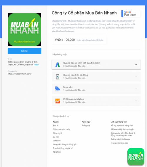 Tham khảo hồ sơ Google Partner của Mua Bán Nhanh: https://www.google.com/partners/?hl=vi#a_profile;idtf=1986341037;