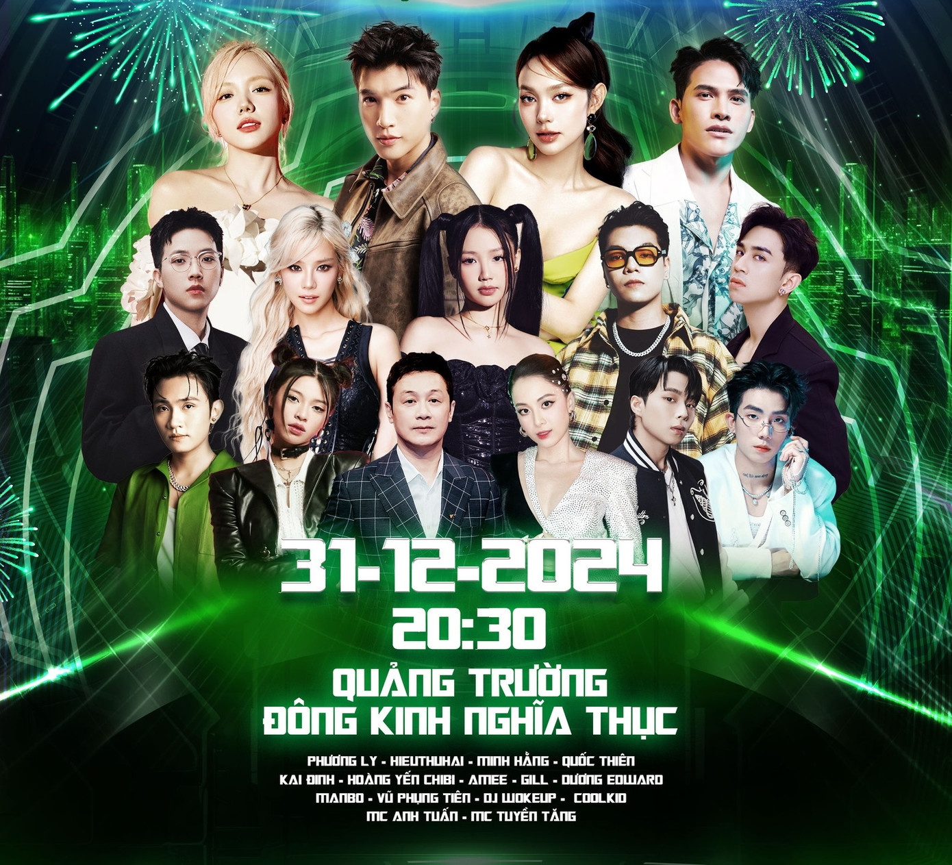 Muốn gặp HIEUTHUHAI, Minh Hằng, Hoàng Yến Chibi, Amee... bạn có thể tới Quảng trường Đông Kinh Nghĩa Thục. Địa điểm tổ chức ở quận Hoàn Kiếm nên khoảnh khắc kết thúc của đại nhạc hội cũng là lúc bạn được ngắm pháo hoa bắn từ trận địa 1 và 2. Đêm nhạc dự kiến bắt đầu lúc 20h30 ngày 31/12 và kết thúc lúc 0h30 ngày 1/1/2025.