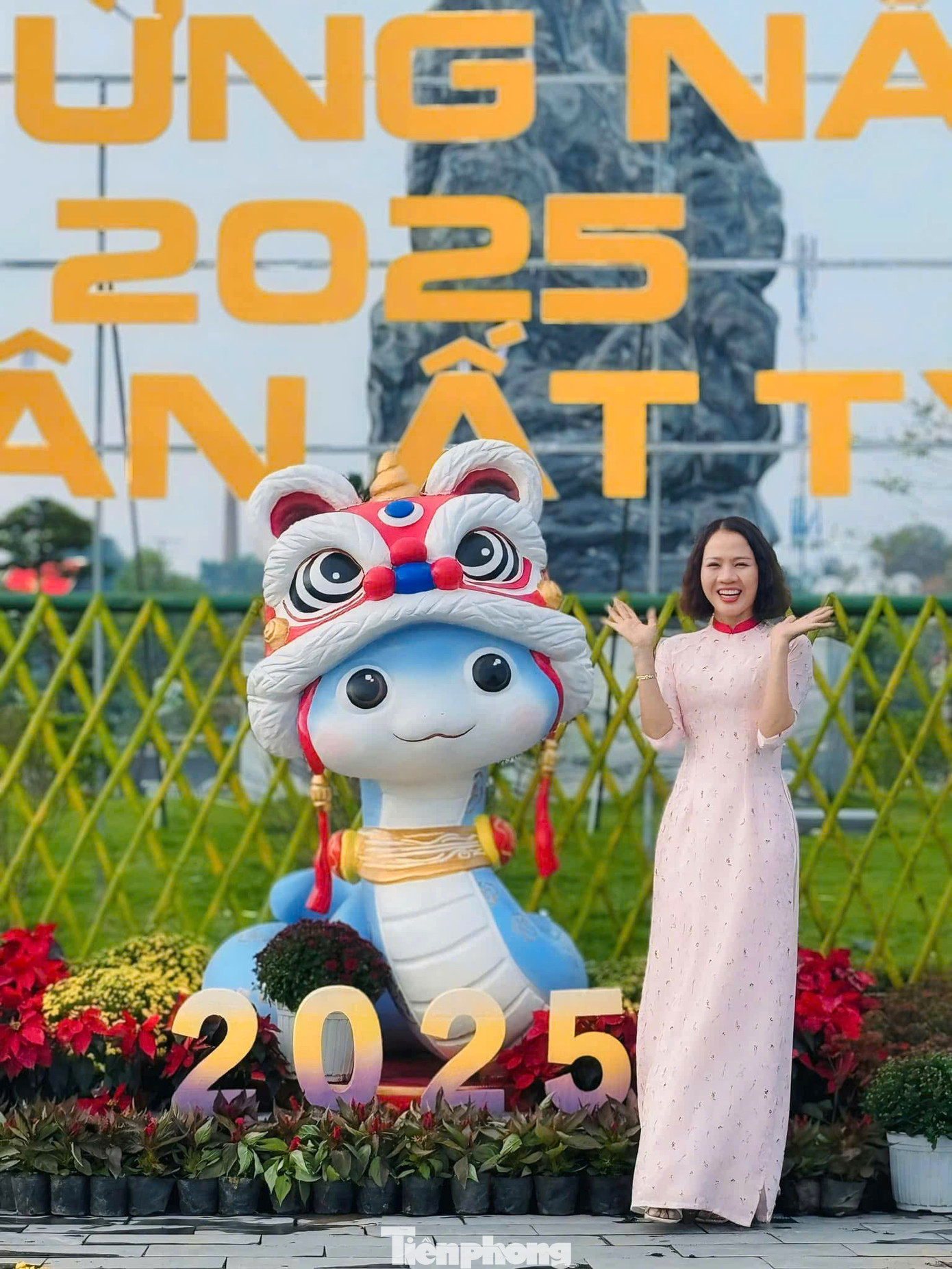 | Nhiều bạn trẻ, các em nhỏ cũng tranh thủ đến chụp hình "check-in" cùng linh vật rắn. Ảnh: Tú Anh |