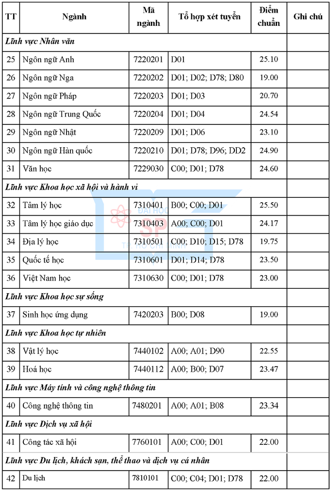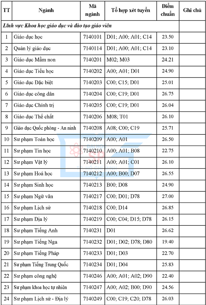 Theo kết quả xét tuyển, ngành sư phạm văn có điểm chuẩn cao nhất với 27 điểm, kế đến là sư phạm lịch sử với 26,85 và sư phạm giáo dục công dân 26,75. Chỉ có 4 ngành điểm chuẩn dưới 20. Cụ thể: