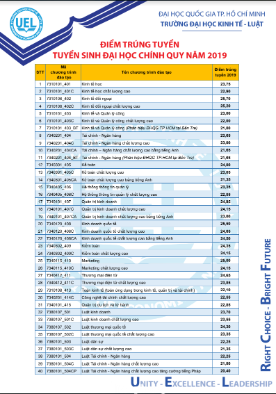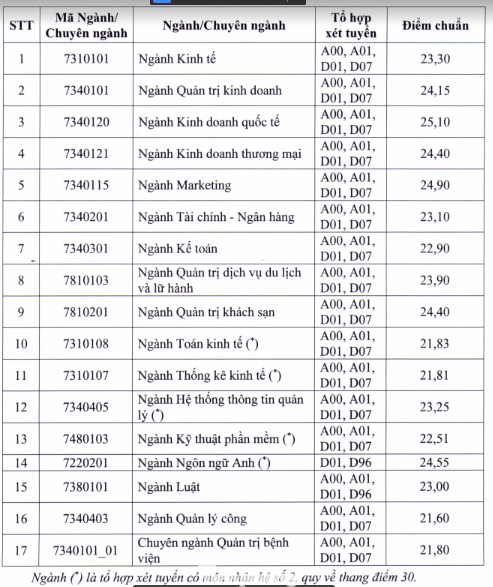 Điểm trung bình trúng tuyển vào Trường là 24,13 điểm, trong đó, điểm trung bình trúng tuyển khối ngành Kinh tế là 24,02 điểm, khối ngành Kinh doanh & quản lý là 24,38 điểm và khối ngành Luật là 23,51 điểm.