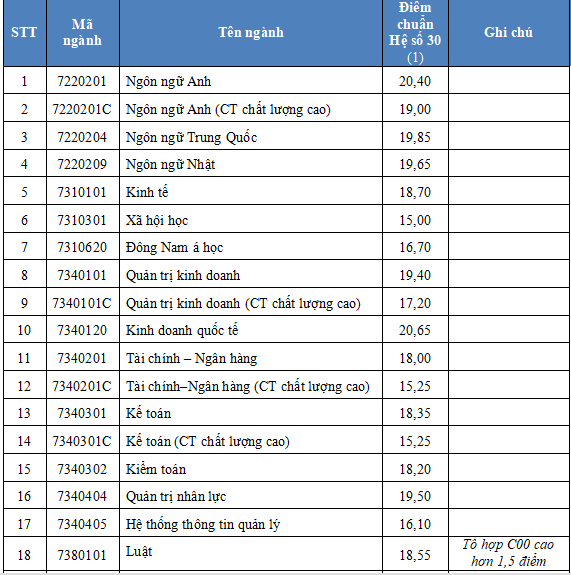 Nhóm ngành có điểm trúng tuyển cao, từ trên 19 điểm gồm: Ngôn Ngữ Anh, Ngôn Ngữ Trung Quốc, Ngôn ngữ Nhật; Quản trị kinh doanh, Kinh doanh Quốc tế, Quản trị nhân lực và Luật Kinh tế