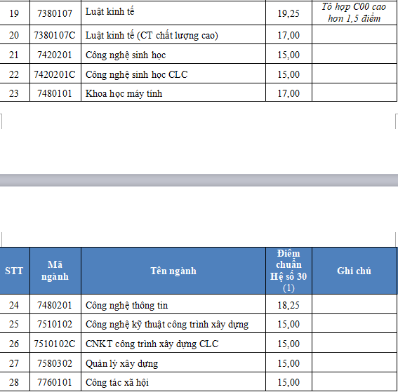 Nhóm ngành có điểm thấp bằng điểm sàn hoặc cao hơn 1 chút (từ 15 điểm đến dưới 17điêm), gồm: Đông Nam Á, Công nghệ sinh học, Hệ thống thông tin quản lý, Công nghệ kỹ thuật công trình xây dựng, Quản lý xậy dựng, Xã hội học và công tác xã hội.
