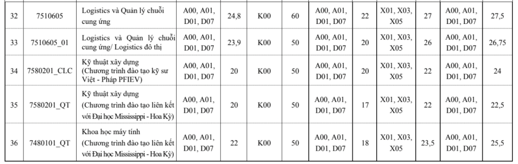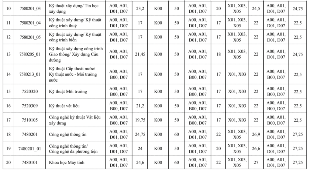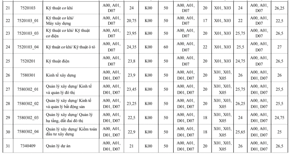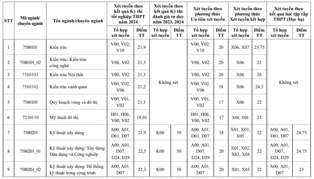 Điểm chuẩn trường Đại học Xây dựng Hà Nội năm 2024 cụ thể như sau: