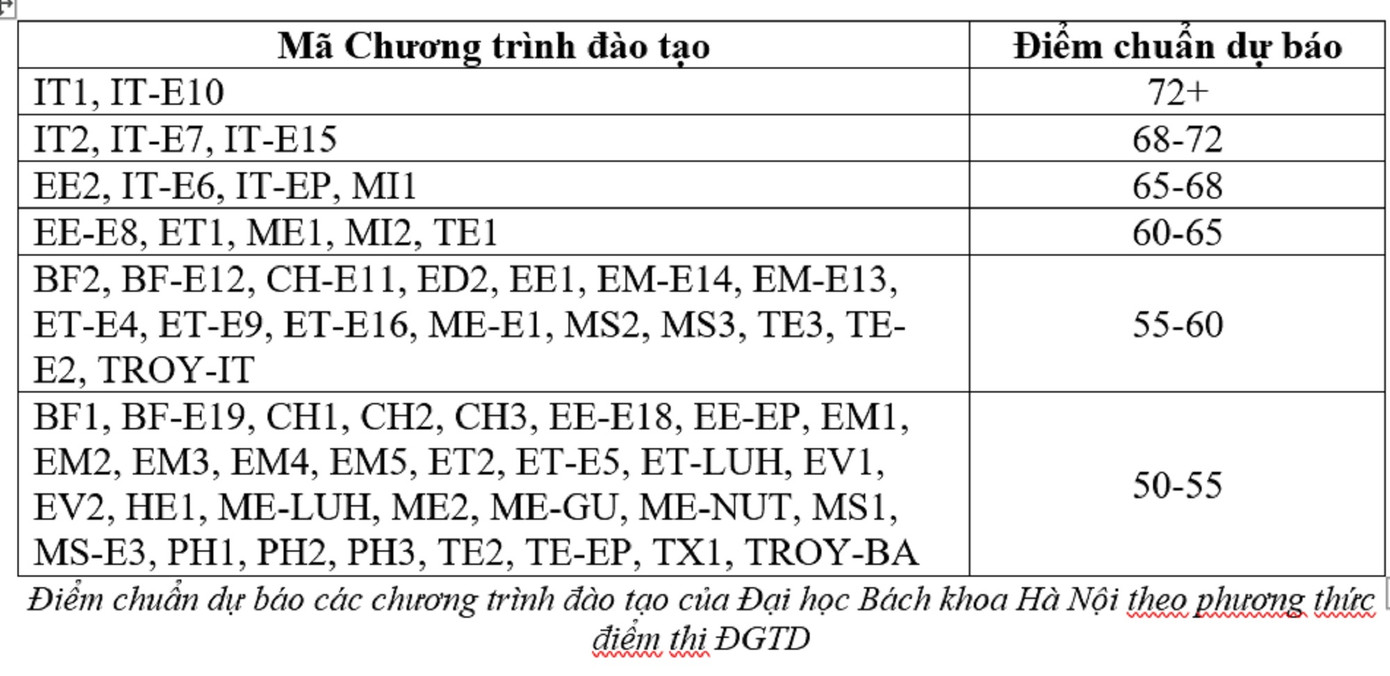 Điểm chuẩn dự báo trên thang 100 điểm bao gồm điểm thi Đánh giá tư duy, điểm ưu tiên (điểm khu vực, đối tượng) và điểm thưởng (IELTS). Ngưỡng đảm bảo chất lượng, hay mức điểm xét tuyển tối thiểu đối với phương thức xét bằng điểm thi đánh giá tư duy của Đại học Bách khoa Hà Nội dự kiến là 50 điểm.