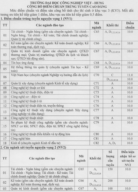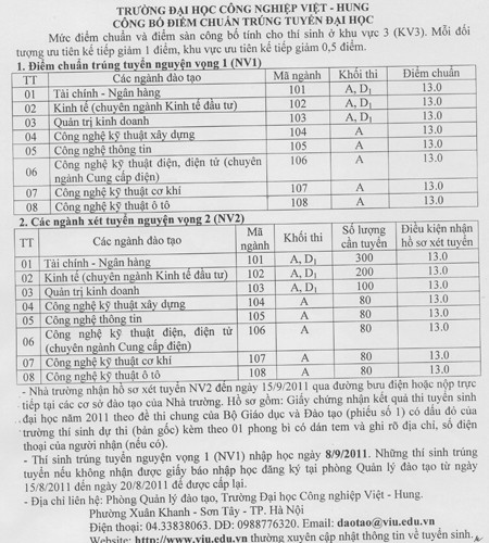 2. ĐH Việt- Hung: Điểm trúng tuyển, chỉ tiêu NV2 vào các ngành hệ ĐH như sau: