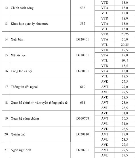 HV Báo chí và Tuyên truyền cũng vừa đưa ra mức điểm chuẩn dự kiến của các ngành theo tổ hợp môn xét tuyển đến hết ngày 18/8. Theo đó, điểm chuẩn các ngành dao động từ 17 đến 31 điểm.