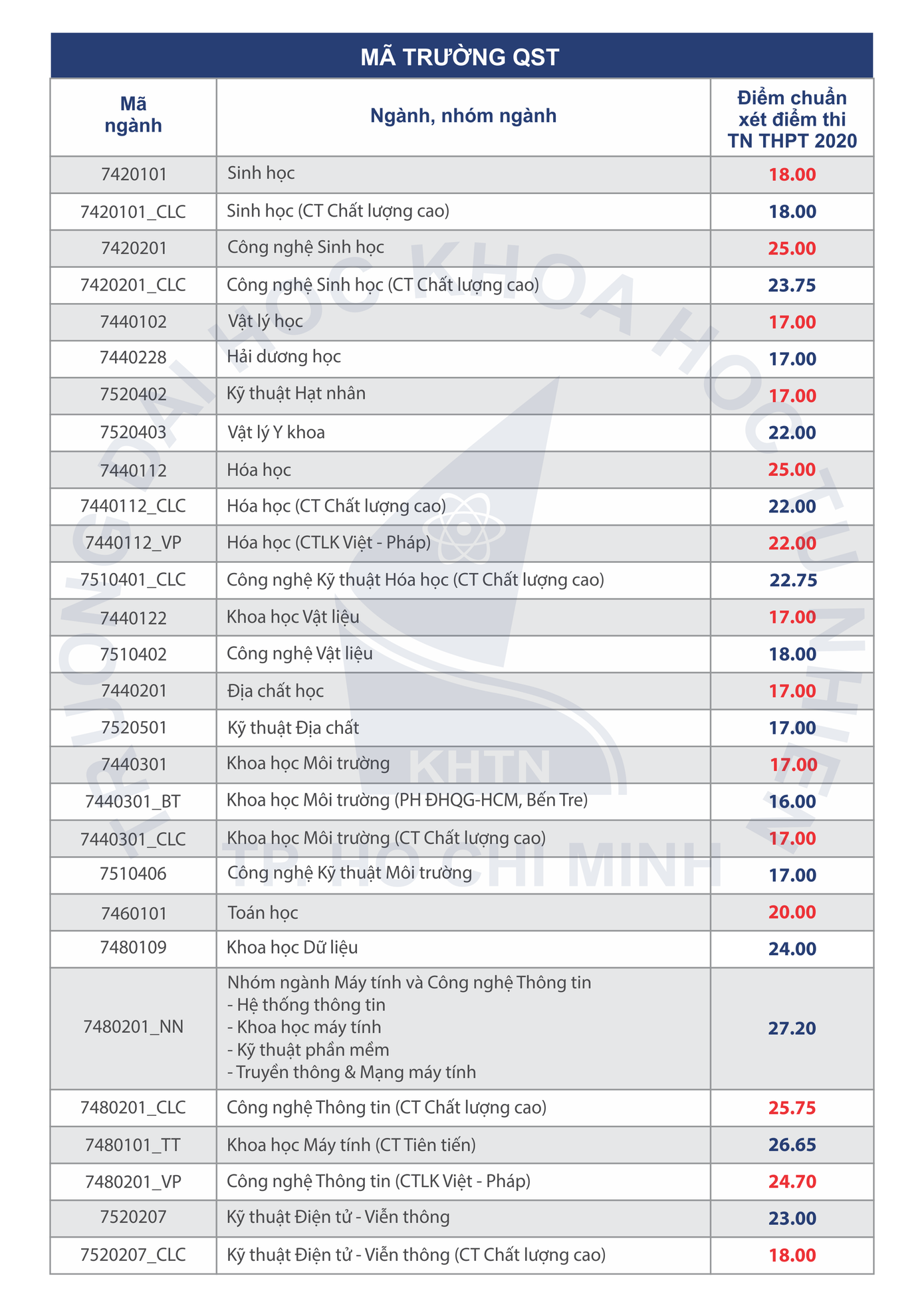 Điểm chuẩn các ngành đào có điểm chuẩn từ 17,00 điểm đến 27,20 điểm và điểm chuẩn cho ngành Khoa học môi trường đào tạo tại Phân hiệu ĐHQG-HCM tại tỉnh Bến Tre là 16,00 điểm.