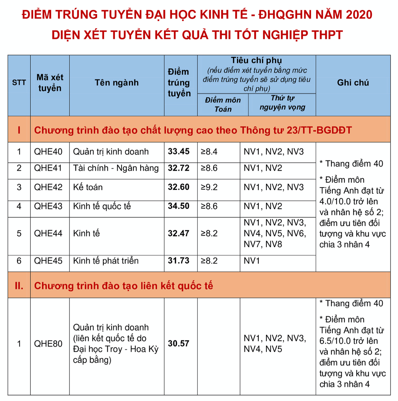 Theo đó, điểm chuẩn của trường trường ĐH Kinh tế (ĐHQG Hà Nội) năm nay nằm trong khoảng 30,57 - 34,5 điểm. Ngành Kinh tế Quốc tế là ngành có điểm chuẩn cao nhất và ngành có điểm thấp nhất là ngành Quản trị Kinh doanh.