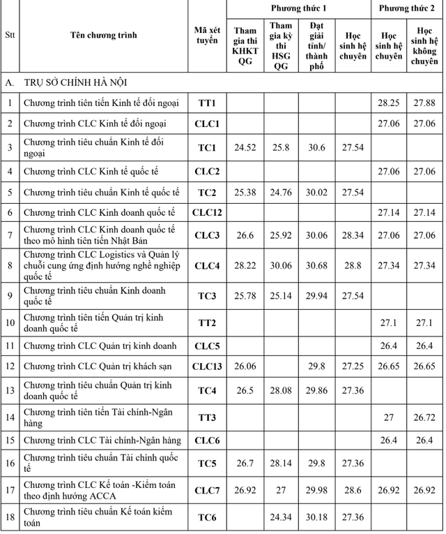 Theo phương án 1, Trường Đại học Ngoại Thương xét tuyển dựa trên kết quả học tập THPT dành cho thí sinh tham gia thi học sinh giỏi quốc gia, đạt giải học sinh giỏi cấp tỉnh/ thành phố lớp 11, 12 và hệ chuyên của trường THPT chuyên.
