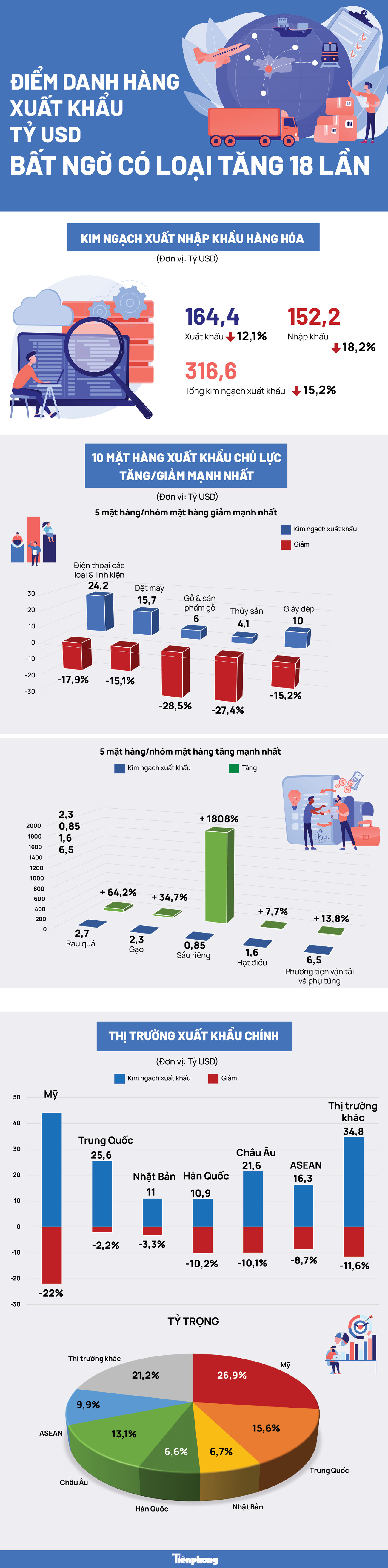 TPO - Trong bối cảnh thương mại suy giảm, trong 6 tháng đầu năm nay Việt Nam vẫn có 27 mặt hàng đạt kim ngạch xuất khẩu trên 1 tỷ USD, giảm 2 mặt hàng so với cùng kỳ năm ngoái. Có 5 mặt hàng xuất khẩu trên 10 tỷ USD, đặc biệt có mặt hàng xuất khẩu tăng gấp 18 lần.