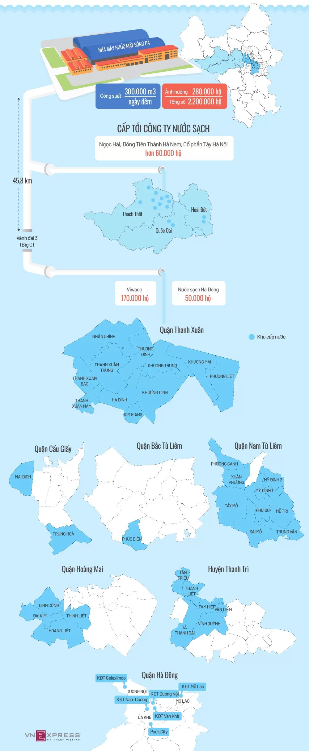 Công ty CP Đầu tư nước sạch Sông Đà (Viwasupco) hiện là đầu mối cấp nước cho toàn bộ khu vực phía Tây Nam thành phố Hà Nội, gồm các quận Thanh Xuân, Hoàng Mai, Cầu Giấy, Hà Đông và một số quận nội thành cùng một số khu vực thuộc Hệ thống cấp nước chuỗi đô thị Sơn Tây – Hòa Lạc – Xuân Mai – Miếu Môn – Hà Nội – Hà Đông.