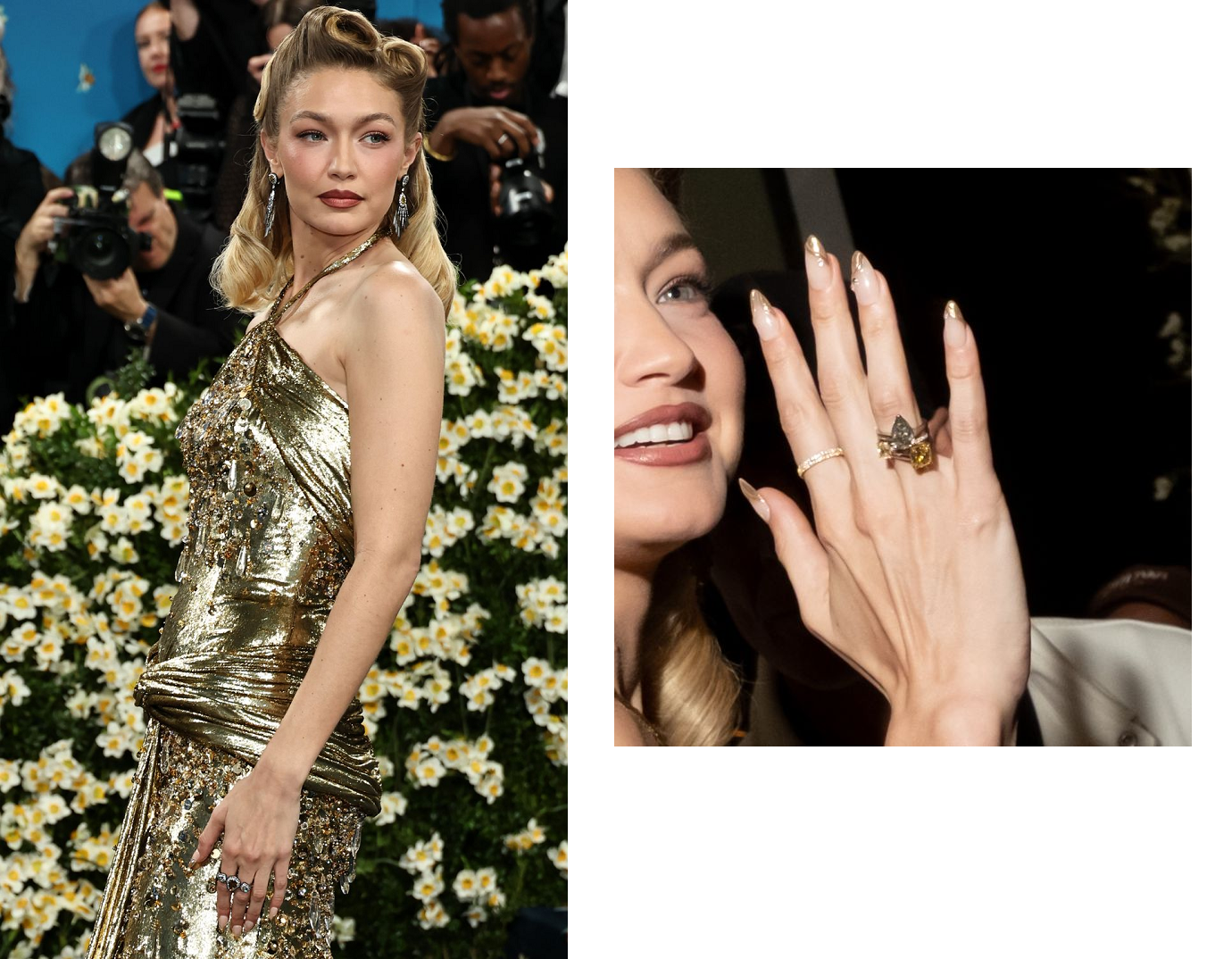 Móng tay kiểu Pháp, tông màu vàng gold phù hợp với toàn bộ trang phục và concept tạo hình của Gigi Hadid. Chi tiết 3D trên móng làm tăng thêm tính nghệ thuật và sự chuẩn bị kĩ càng của nàng siêu mẫu đối với sự kiện đặc biệt này.