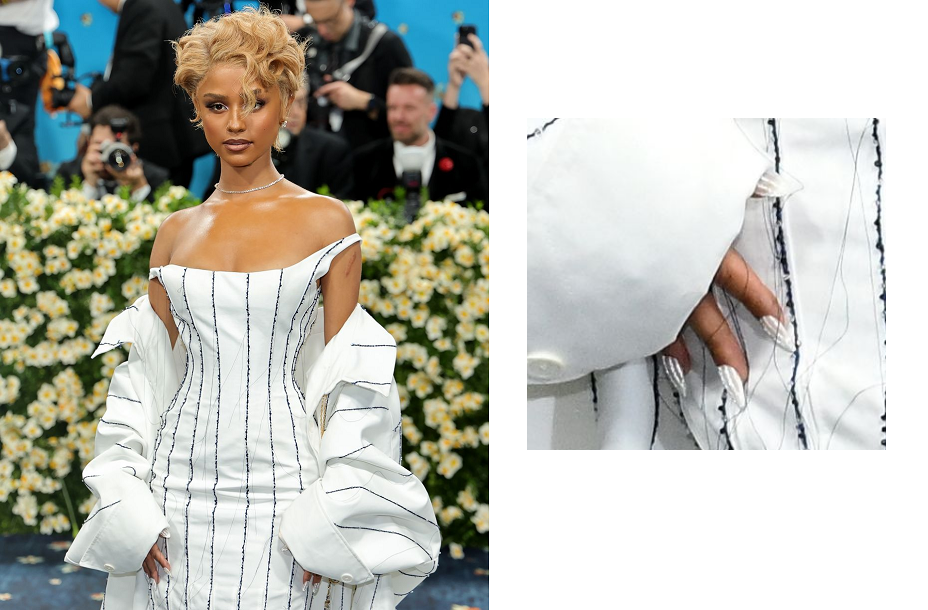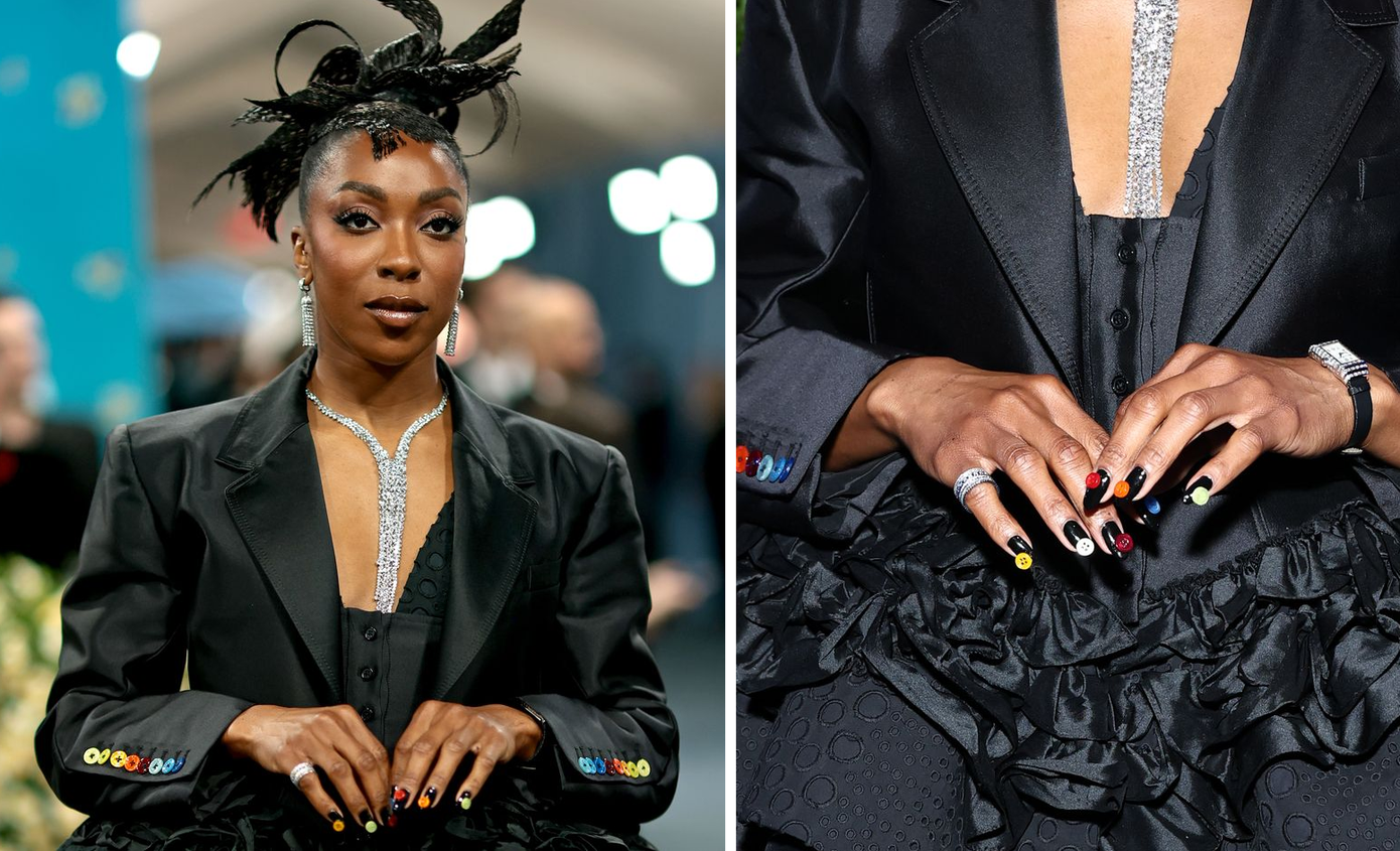 Ego là một trong những người nổi tiếng đầu tiên sải bước trên thảm đỏ Met Gala. Cô ấy xuất hiện cùng những chiếc móng tay tạo hình cúc áo đầy màu sắc, nổi bật trên nền móng màu đen huyền bí. Thiết kế nails của Ego nhìn tương đồng với chi tiết trang trí trên tay áo vest của cô, chứng tỏ mọi chi tiết đều có sự tính toán và sắp xếp để hòa hợp cùng nhau.