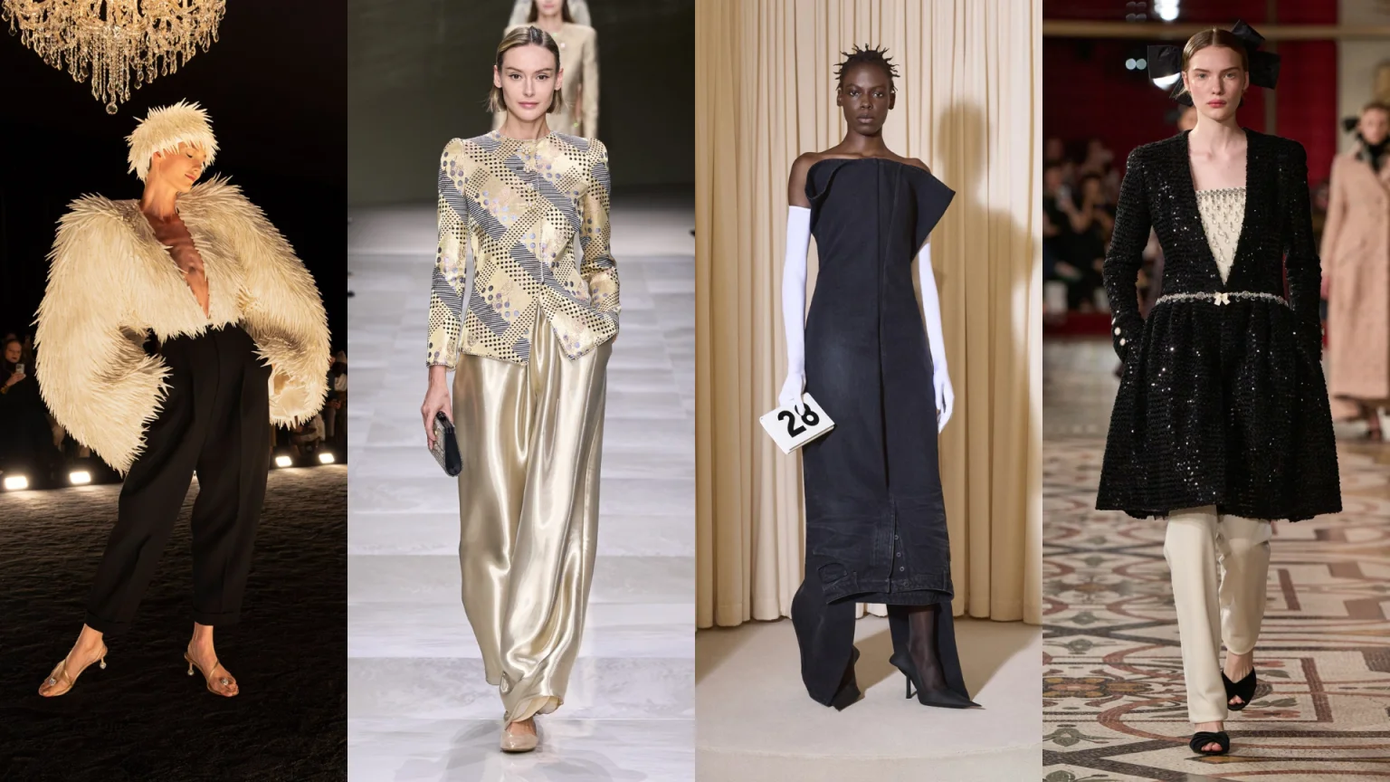 Trên sàn diễn Schiaparelli Couture Fall 2024 xuất hiện chiếc quần âu, lưng cao, rộng từ đùi rồi túm lại ở cổ chân. Trong khi đó, Armani Privé ra mắt phiên bản quần rộng rãi hơn bằng vải satin bóng, màu trắng ngà ngọc trai. Chanel thì phối những chiếc áo khoác dài cùng quần âu ống đứng, cổ điển.