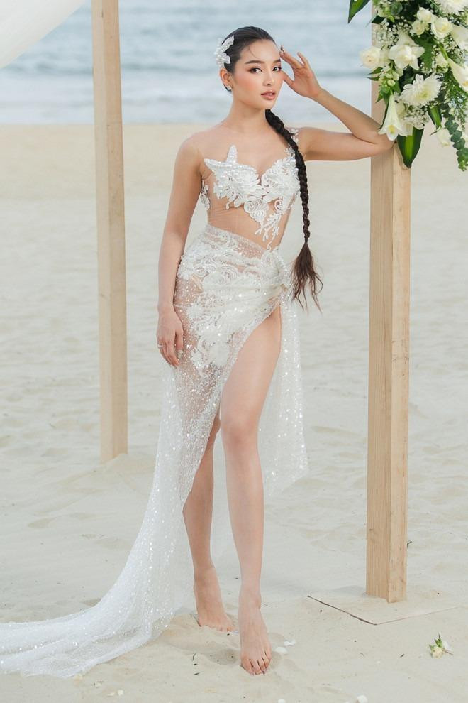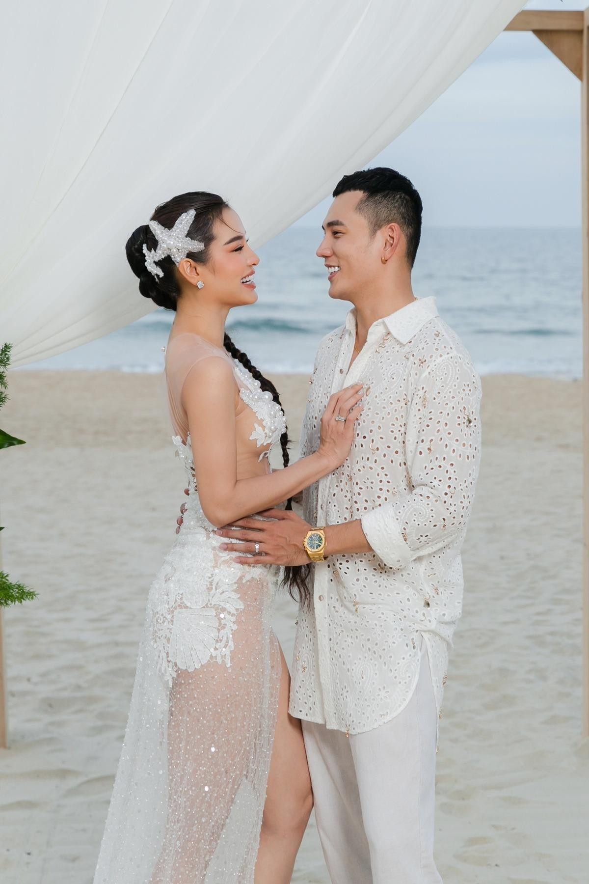 Sau đám cưới hoành tráng ở TP.HCM, Lý Bình và Phương Trinh Jolie tiếp tục tổ chức lễ cưới ở biển bên gia đình, người thân. Tại một không gian phóng khoáng hơn, Phương Trinh Jolie hoá "nàng tiên cá" với bộ váy sexy, khoe eo thon và vòng một gợi cảm. Người đẹp diện thêm váy cưới trắng xuyên thấu, khoe lợi thế body.