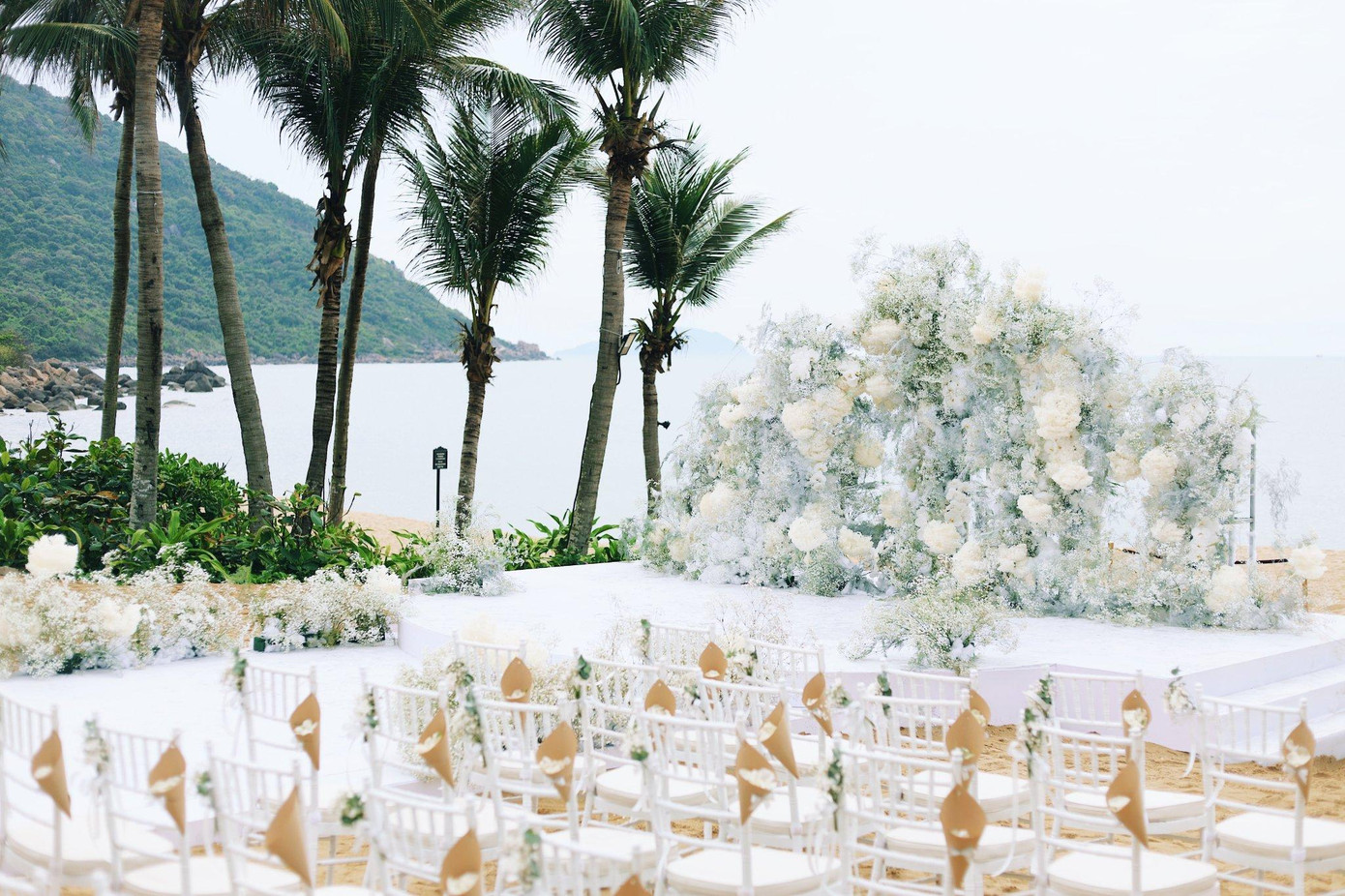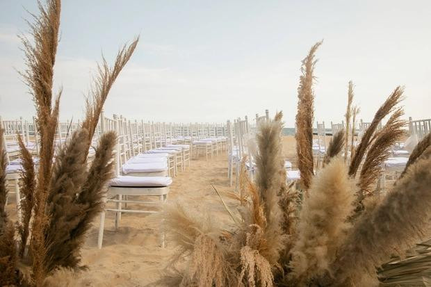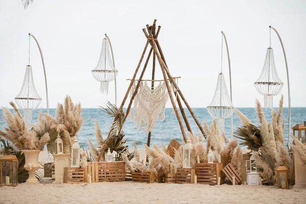 Lễ đường trên bờ biển được trang trí bằng tông màu nâu – trắng chủ đạo và sử dụng cỏ lau thay vì hoa tươi như bao đám cưới thông thường. Nữ ca sĩ tự lên ý tưởng và làm đạo diễn cho ngày trọng đại của đời mình.