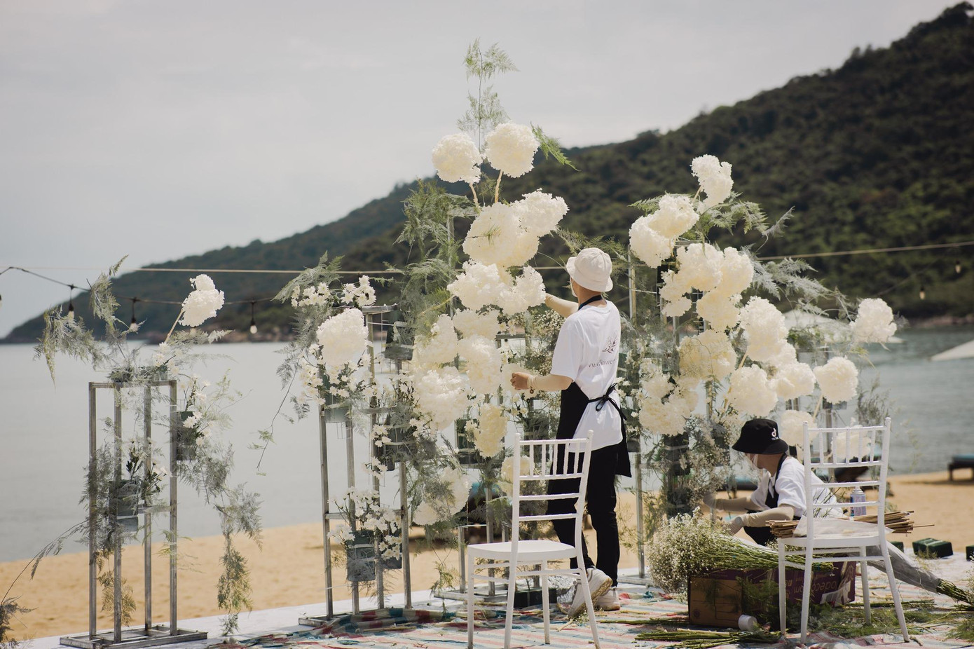 | Lễ cưới được trang trí theo tông màu trắng. Giọng ca Bad Boy nhập tổng cộng 2 tấn hoa baby từ nước ngoài về để phục vụ đám cưới. |