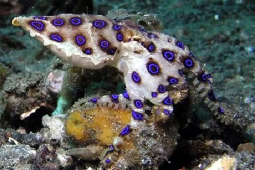 Hầu hết chúng là những chất độc nguy hiểm có tỷ lệ tử vong cao trong thời gian rất nhanh, với liều độc thấp. Cụ thể, chất độc chứa trong cá nóc và nhiều loại hải sản khác như mực đốm xanh, so biển, cá bống vân mây, v.v.. là tetrodotoxin, có tác động trên thần kinh trung ương rất mạnh làm liệt các trung khu thần kinh, gây tê liệt cơ thể, ngừng tuần hoàn, hô hấp dẫn đến tử vong nhanh chóng. Ảnh: Mực đốm xanh.