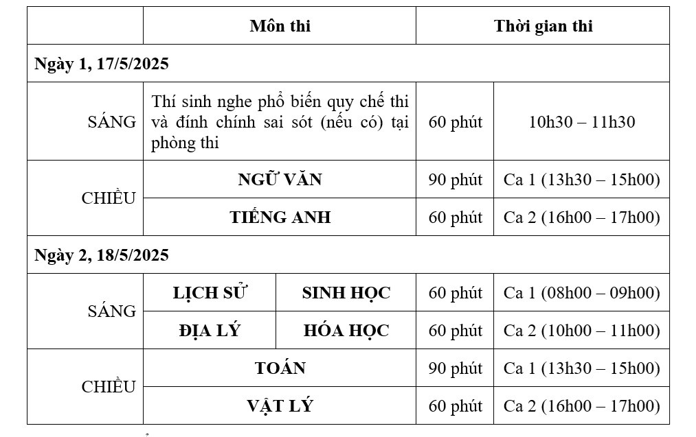 Thời gian tổ chức kì thi diễn ra trong 2 ngày 17-18/5/2025 (năm 2024 diễn ra trong 1 ngày) với các môn thi không thay đổi là Toán, Ngữ văn, tiếng Anh, Địa lí, Lịch sử, Hóa, Sinh, Vật lí. Việc tăng thêm 1 ngày giúp thí sinh có thể lựa chọn nhiều môn thi trong tổ số các môn thi được tổ chức. Như vậy thí sinh có thể lựa chọn thi ít nhất 1 môn thi và nhiều nhất là 6 môn thi. Năm 2024 do chỉ tổ chức thi trong 1 ngày nên thí sinh chỉ được thi tối đa 5 môn thi.