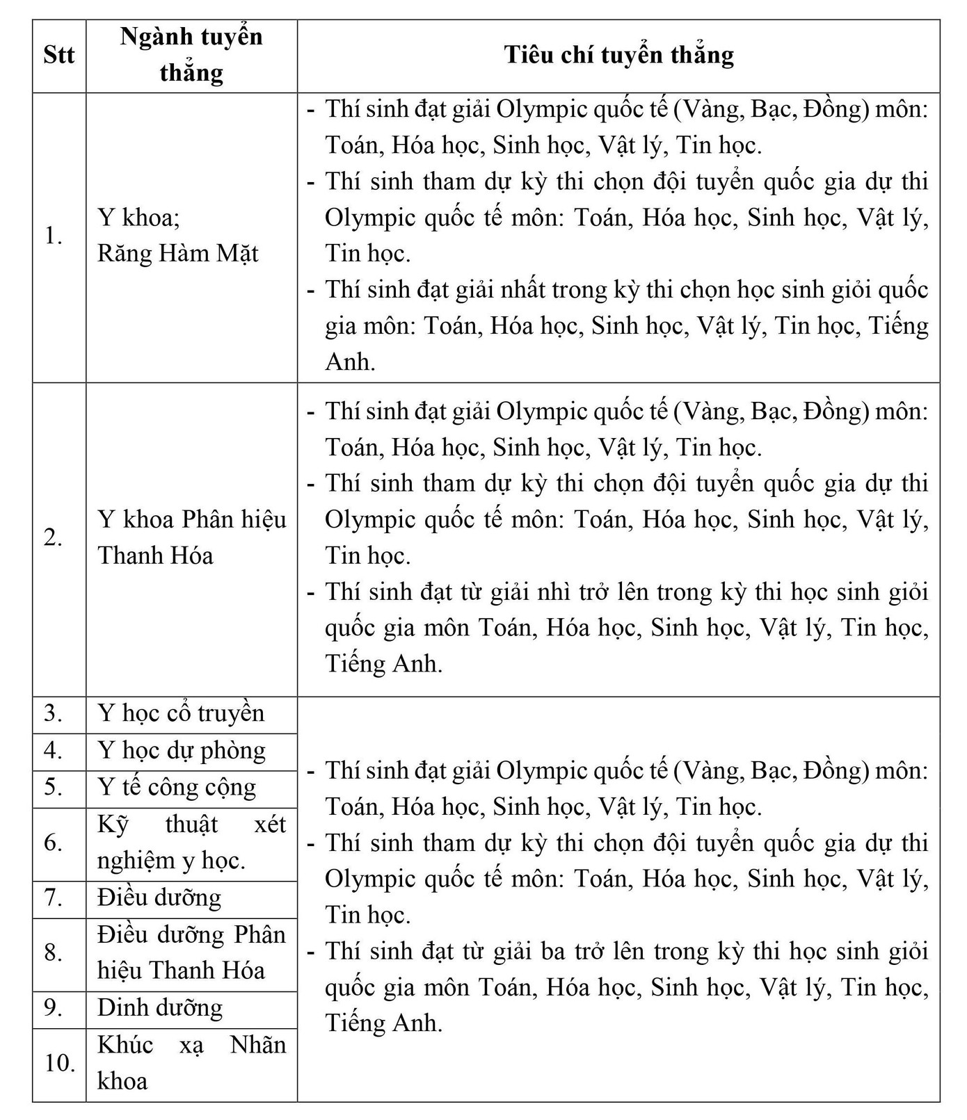 Đối với những thí sinh xét tuyển bằng phương thức này, điểm trúng tuyển thấp hơn điểm trúng tuyển ngành Y khoa của phương thức xét tuyển 1 không quá 3 điểm và không được thấp hơn ngưỡng đảm bảo chất lượng đầu vào do Trường quy định. Trong trường hợp không tuyển đủ 10% chỉ tiêu (tương đương với 40 chỉ tiêu), Nhà trường sẽ dành chỉ tiêu còn lại cho ngành Y khoa của phương thức xét tuyển 1.