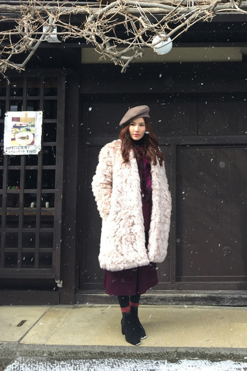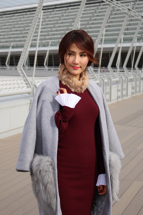 Người đẹp 9x phối áo khoác lông màu be với váy màu đỏ rượu. Lông luôn là chất liệu lên ngôi trong mùa lạnh.