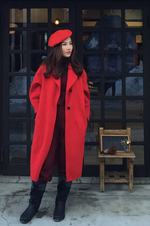Diễm My biến hóa với áo khoác dáng dài đỏ rực và mũ nồi cùng tông. Những kiểu áo cô chọn đều nằm trong top trang phục hot của Thu Đông 2015.