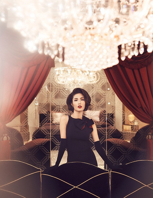 Người đẹp đeo thêm găng tay, tô son đỏ để hoàn thiện phong cách gợi cảm.