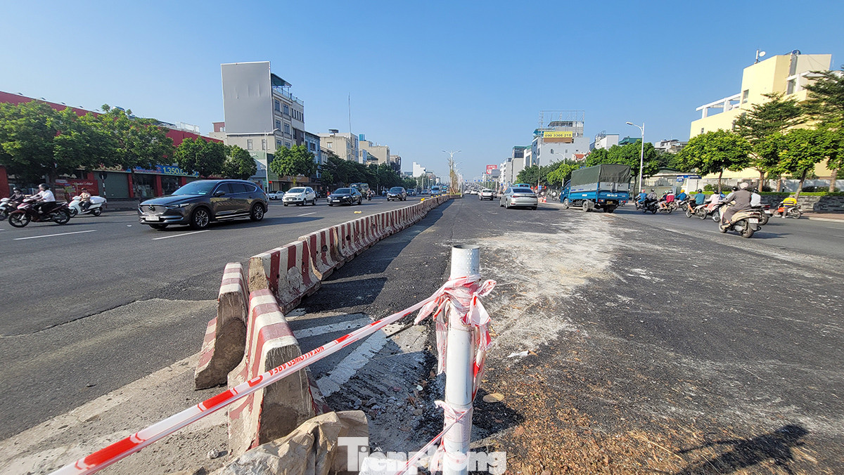 Một phần đường phía bên dự án giai đoạn 1 của cầu Vĩnh Tuy được đơn vị thi công thảm mặt đường mới.