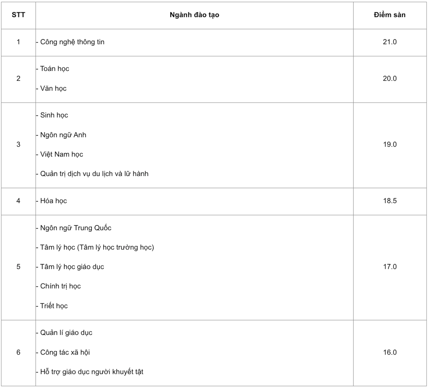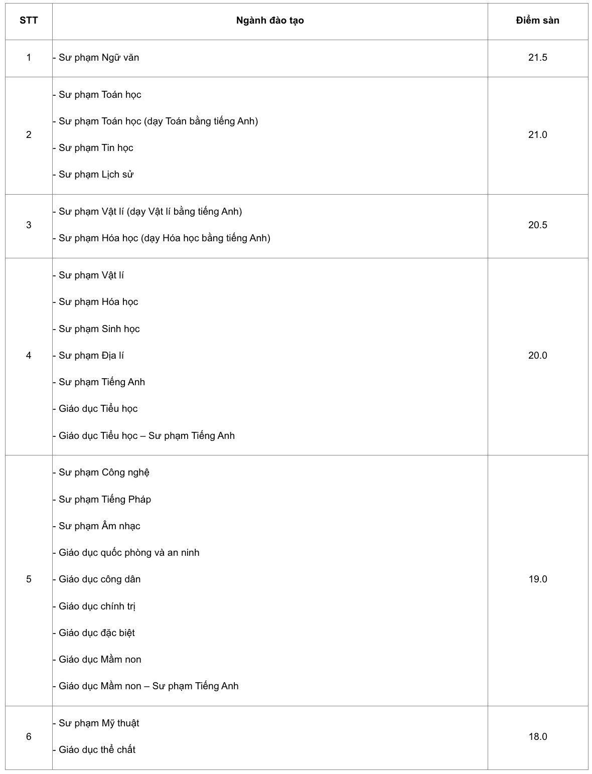 Ngành Sư phạm Vật lý, Hóa học dạy bằng Tiếng Anh cùng lấy mức sàn 20,5. Trong khi đó, Sư phạm Mỹ thuật và Giáo dục thể chất có điểm sàn thấp nhất là 18, bằng ngưỡng đảm bảo chất lượng đối với ngành sư phạm do Bộ Giáo dục và Đào tạo quy định.