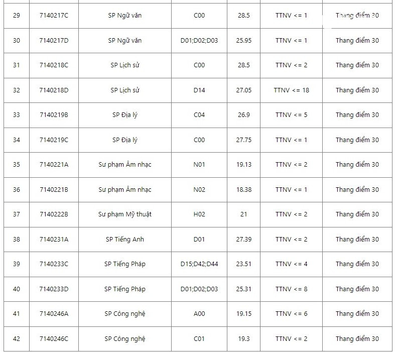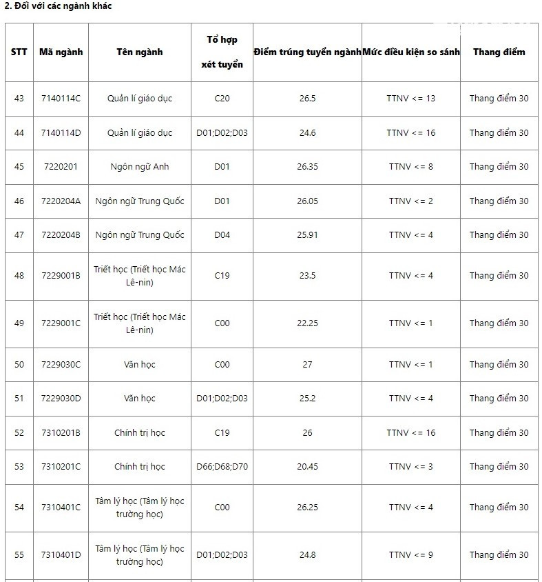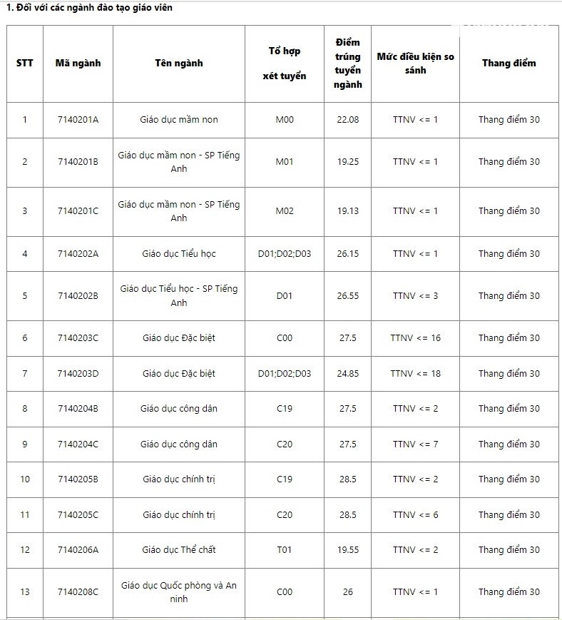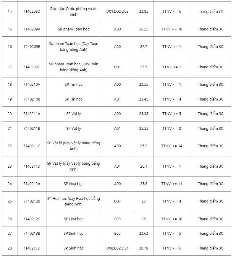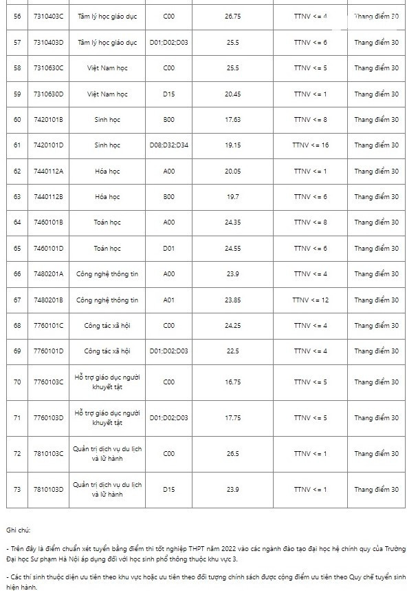 Điểm sàn các ngành sư phạm của Đại học Sư phạm Hà Nội như sau: