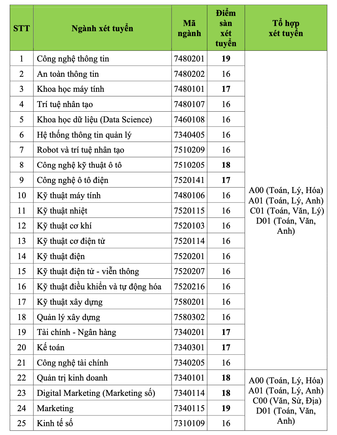 Một số ngành khác có điểm sàn xét tuyển cao là Công nghệ ô tô điện, Khoa học máy tính, Thiết kế đồ họa, Tài chính – ngân hàng, Kế toán, Thú y với 17 điểm. Các ngành còn lại có mức điểm sàn xét tuyển từ 16.