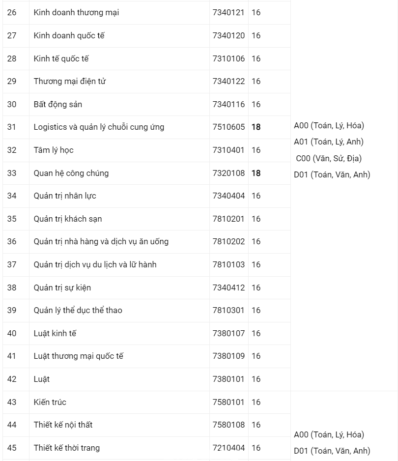 Tiếp theo là các ngành Công nghệ kỹ thuật ô tô, Quản trị kinh doanh, Digital Marketing, Logistics và quản lý chuỗi cung ứng, Quan hệ công chúng với 18 điểm.
