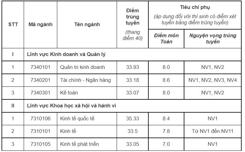 Điểm chuẩn các ngành đều tính trên thang điểm 40, trong đó Tiếng Anh nhân hệ số 2.