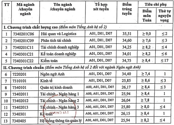 Với các ngành lấy điểm chuẩn thang 40, Hải quan và Logistics cao nhất, những ngành còn lại điểm chuẩn khá tương đồng, đều từ 34 trở lên. Với thang điểm 30, ngành Quản trị kinh doanh cao nhất là 26,17 điểm, Tài chính - Ngân hàng 3 thấp nhất 25,8.