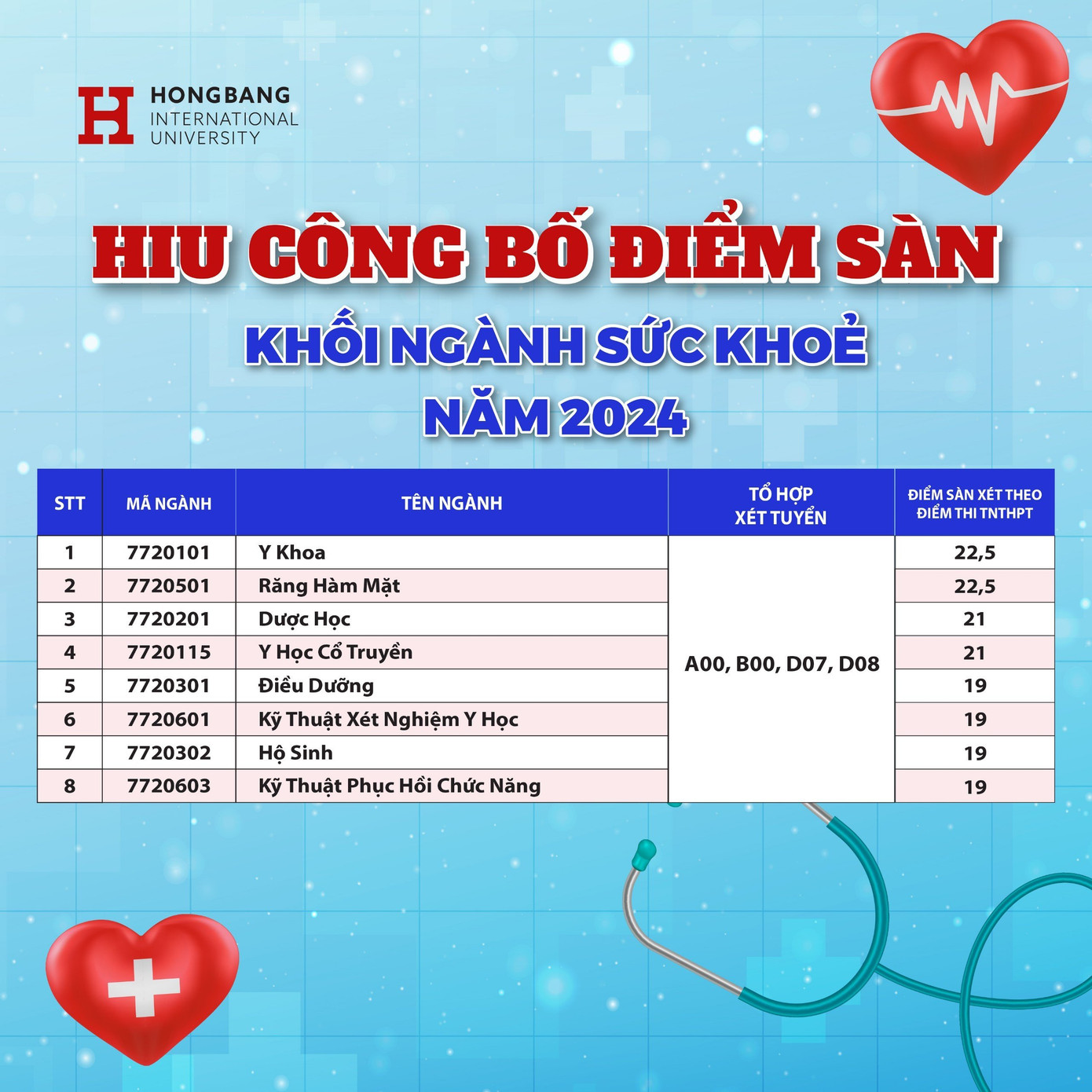 Hội đồng tuyển sinh trường ĐH Quốc tế Hồng Bàng (HIU) vừa công bố điểm sàn xét tuyển theo phương thức xét điểm thi tốt nghiệp THPT 2024 dành cho khối ngành Sức khỏe. Theo đó, mức điểm sàn nhận hồ sơ các ngành khối Sức khỏe vào HIU dao động từ 19 - 22,5 điểm.