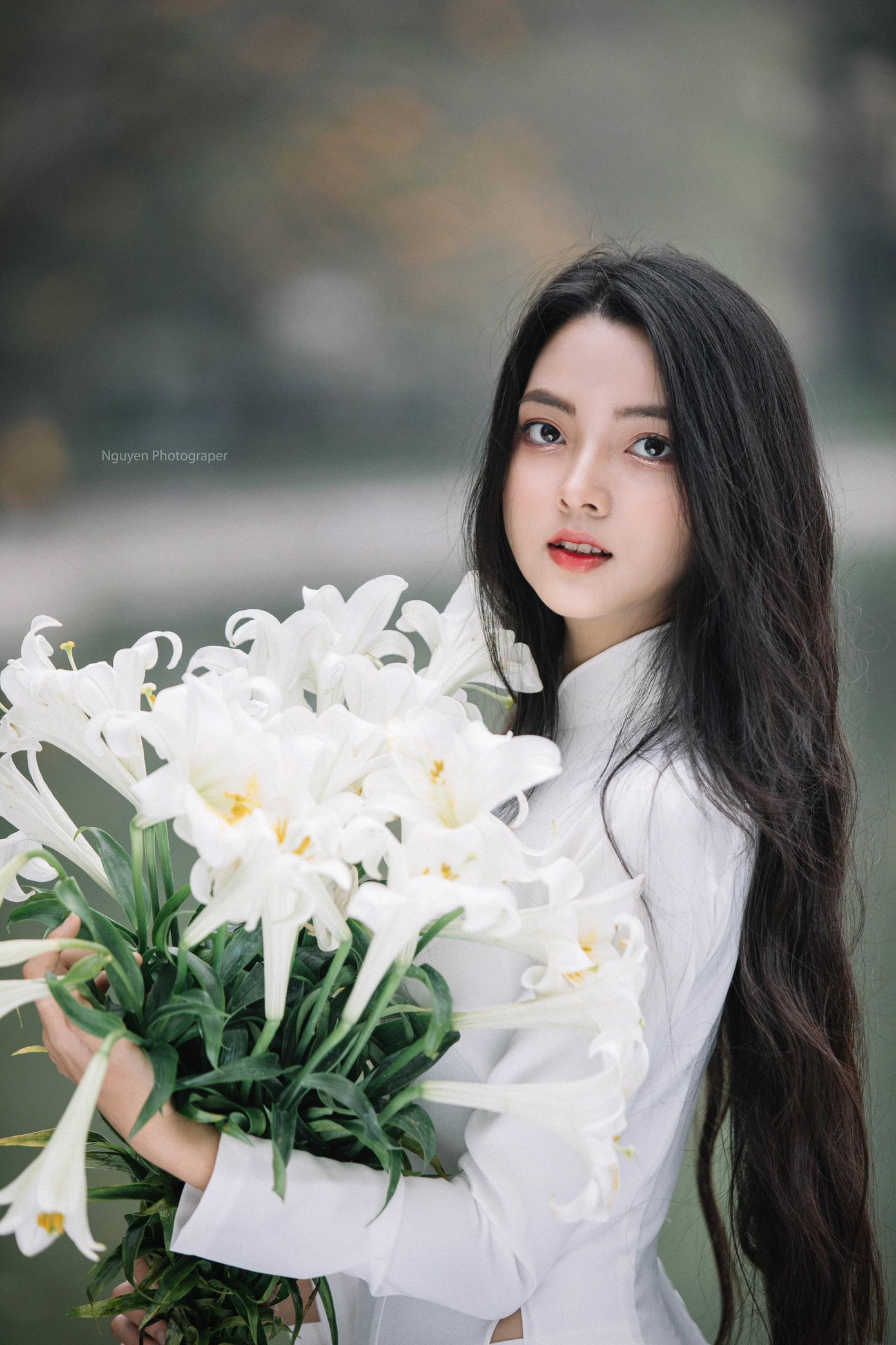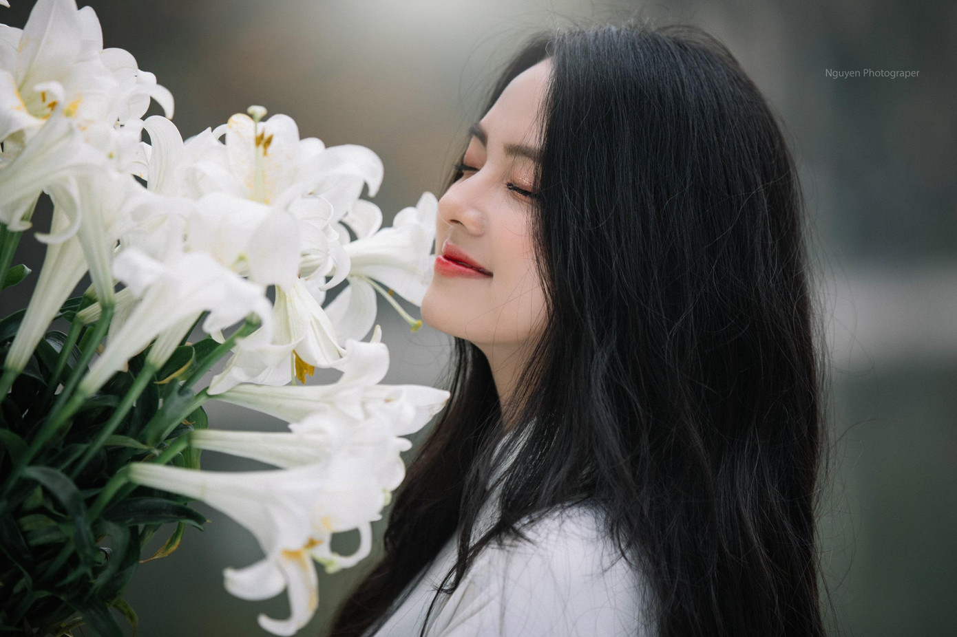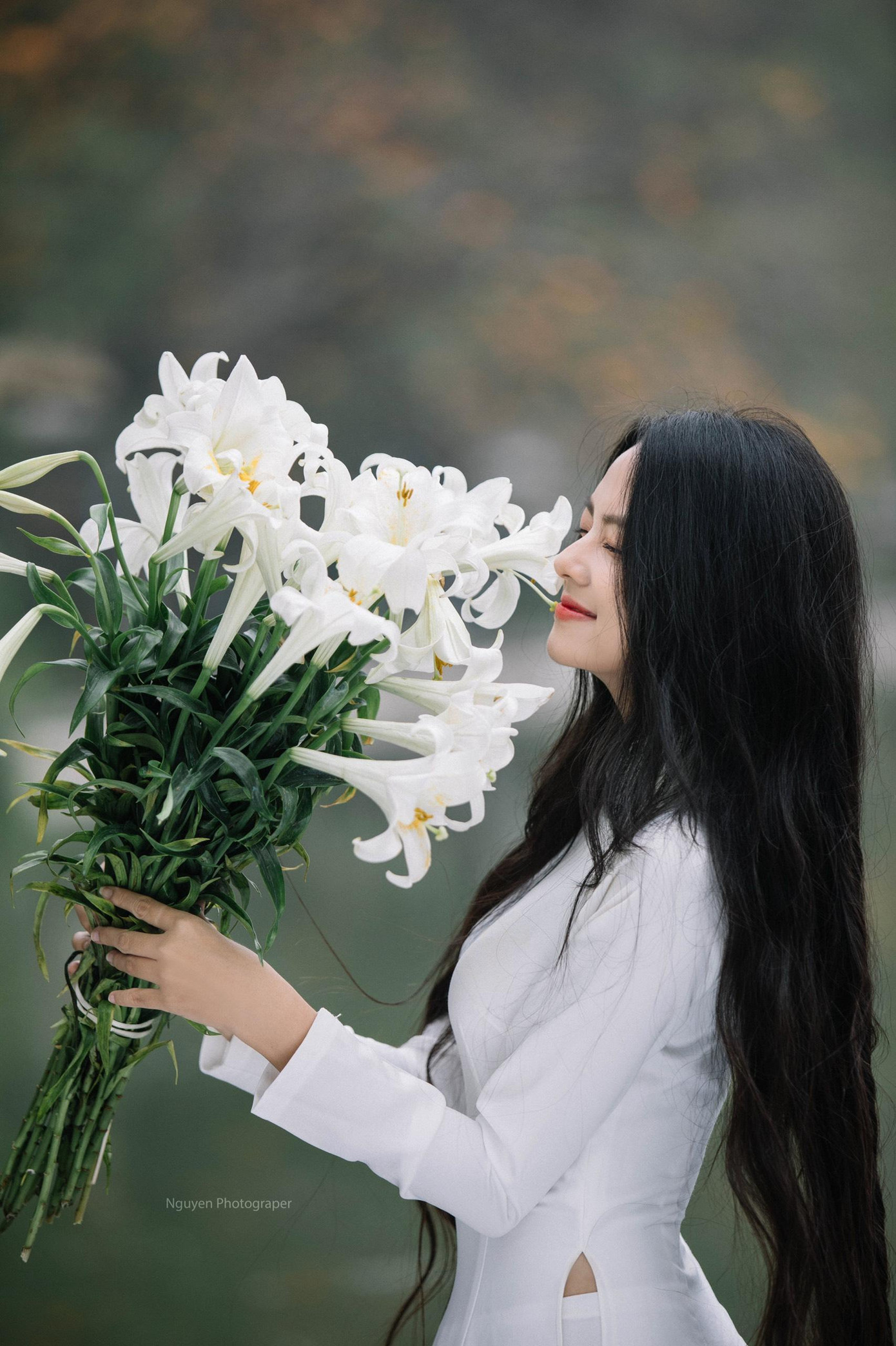 Mới đây nàng mẫu đất Quảng Nam gây ấn tượng khi cho ra mắt bộ ảnh áo dài trắng bên hoa loa kèn cùng mái tóc đen suôn dài. Được biết, nuôi tóc dài là một nét truyền thống của gia đình mà Thảo luôn muốn gìn giữ.