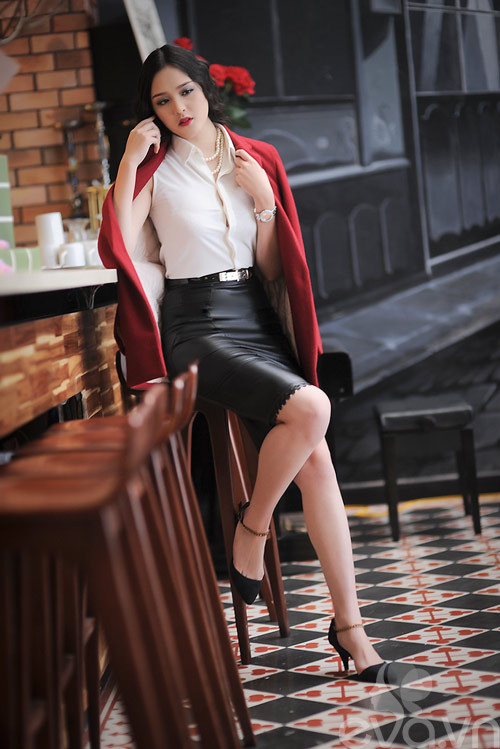 Cặp đôi sơ mi cùng chân váy ôm quen thuộc nơi công sở có thể trở nên thời thượng hơn, phù hợp với cả những bữa tiệc cocktail với chút biến đổi nhỏ: Chân váy bút chì midi giả da và áo blazer đỏ dáng dài khoác hờ.